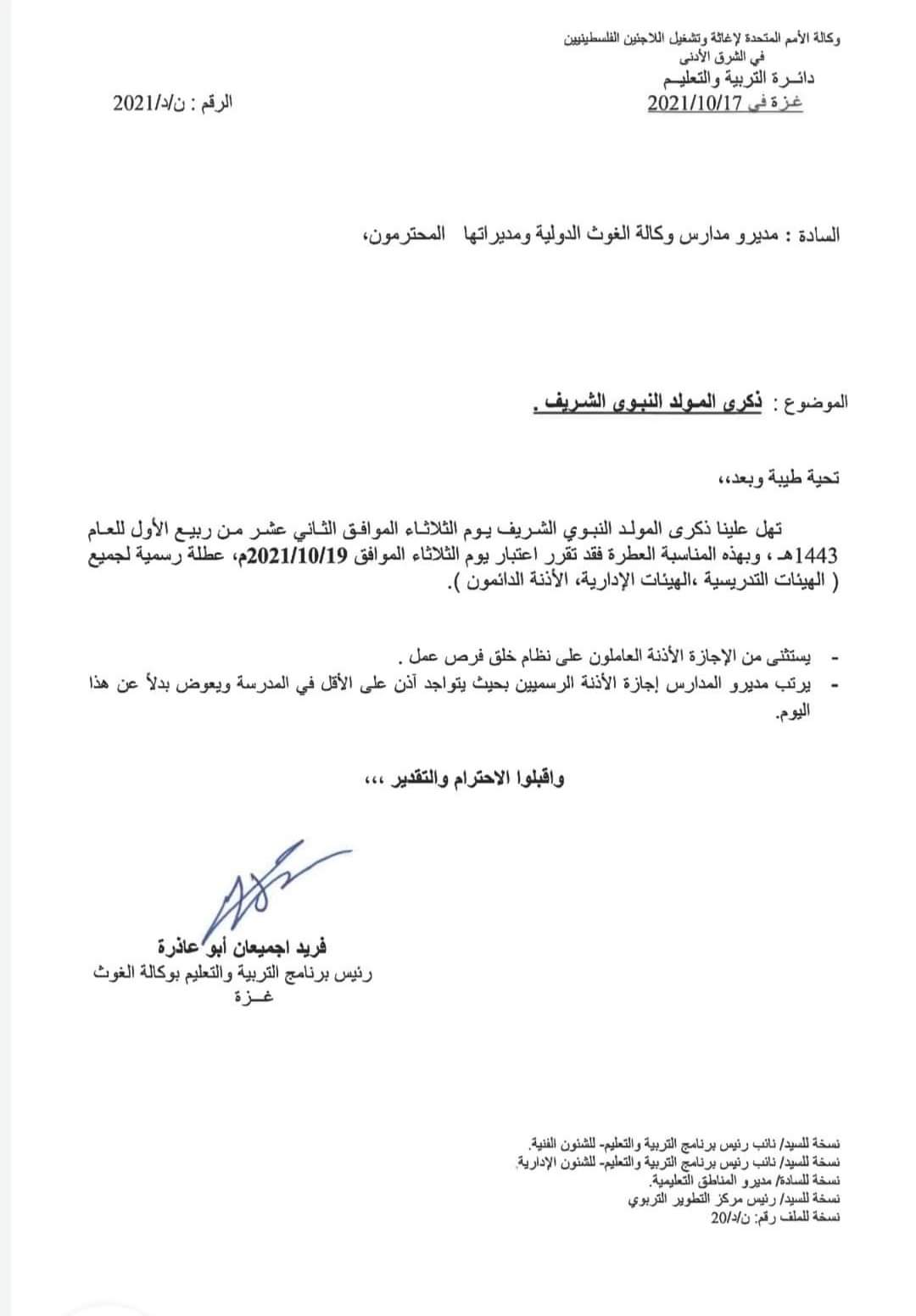 في بيان مقتضب وصل الينا نسخه منه تحية طيبة .. تهل علينا ذكرى المولد النبوي الشريف يوم الثلاثاء الموافق 19/10/2021 عطلة رسمية لجميع الطلاب والهيئة التدرسية والادارية .