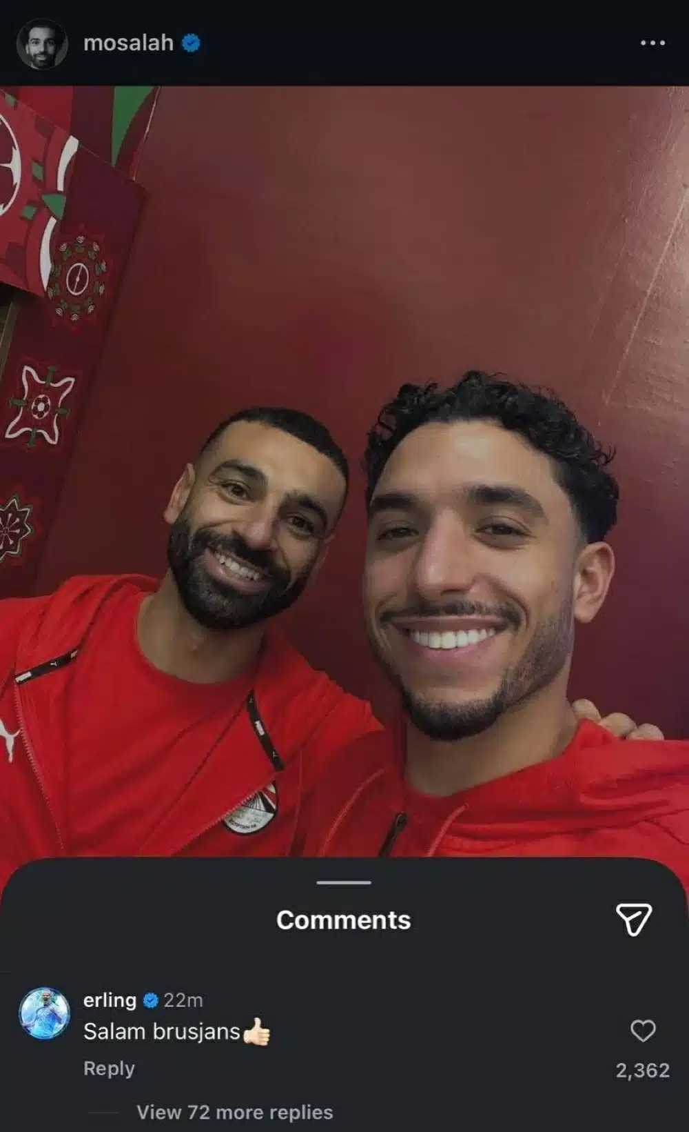علق هالاند على منشور عمر مرموش بعد المباراة قائلاً: «عمرررر» بمدّ الحروف للتعبير عن الحماس، كما حرص على التعليق على منشور محمد صلاح الذي تضمن صورته مع مرموش قائلاً: «تحية لك أخي».